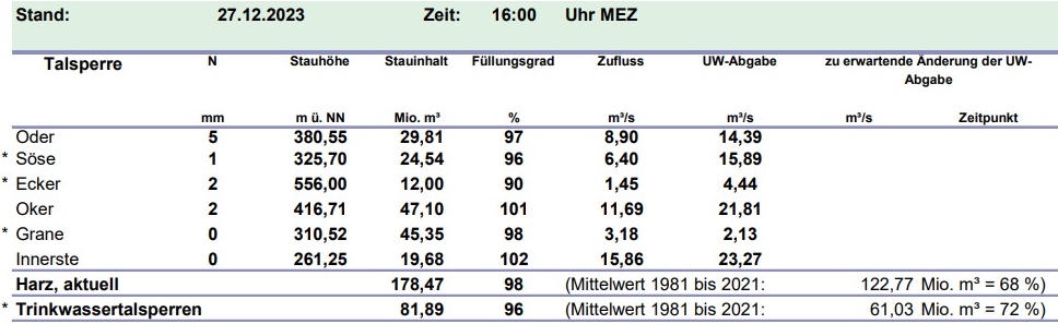 abgelassen wurden. Die folgende Tabelle zeigt die Situation für alle Talsperren der Harzwasserwerke