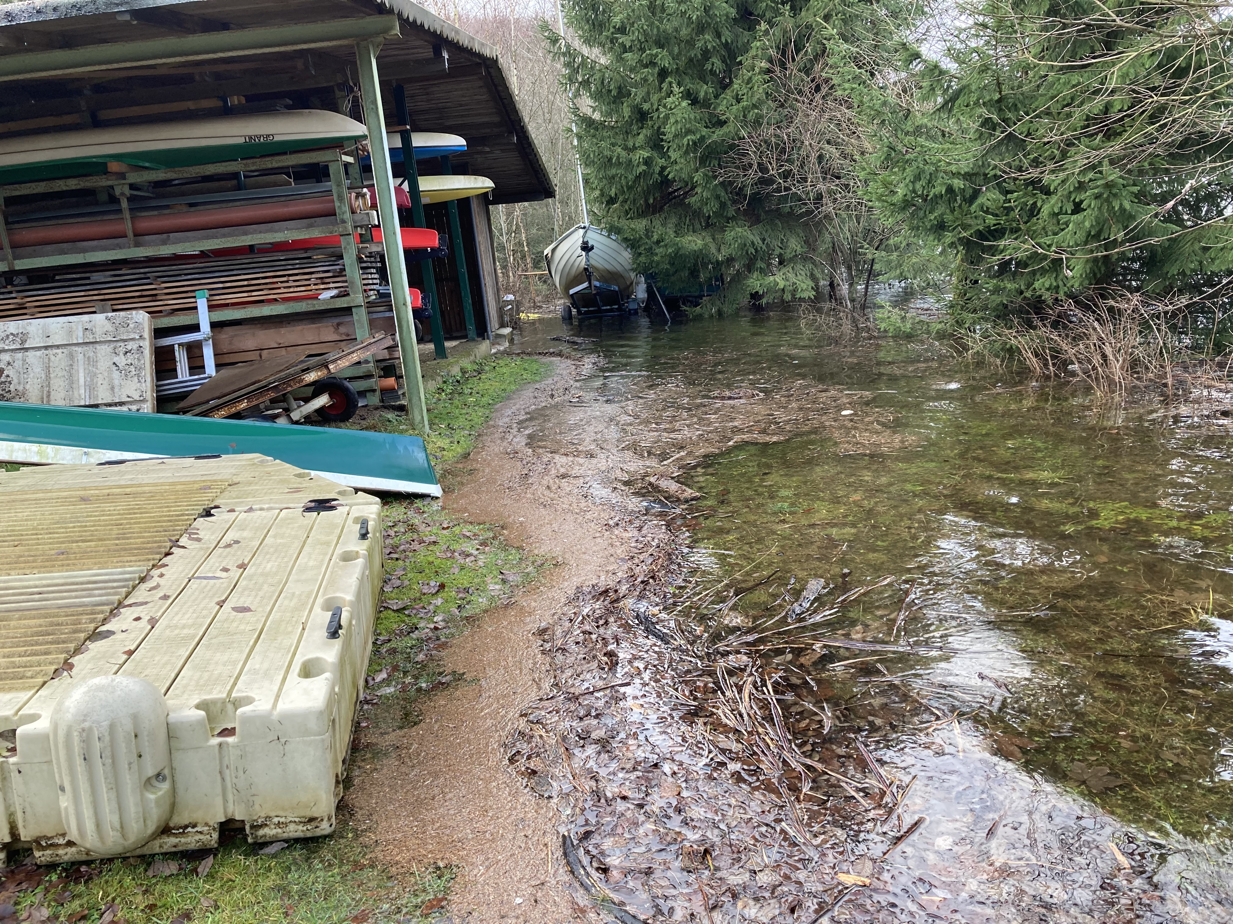 Das Wasser ereicht das Außenlager mit den Kanus. |