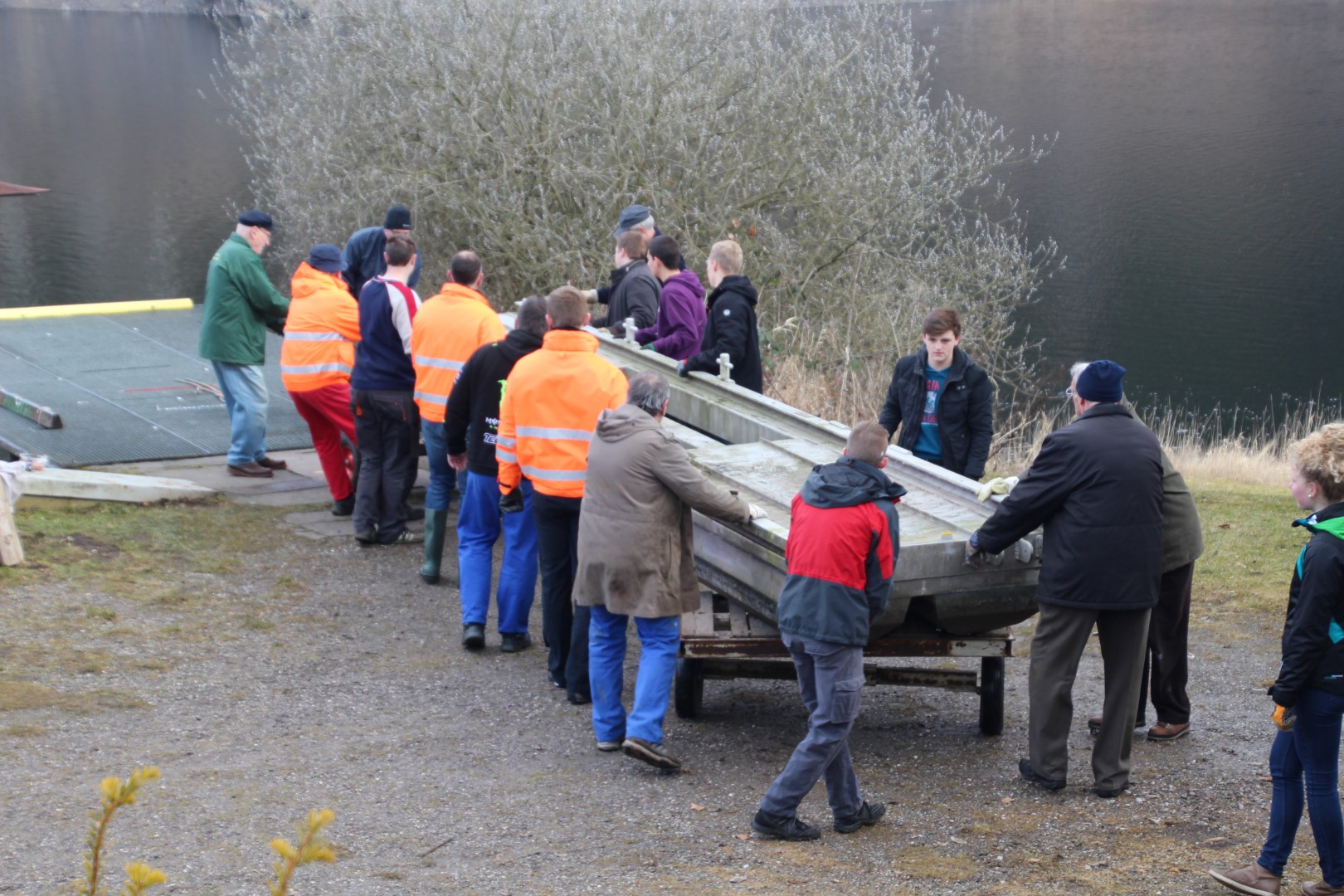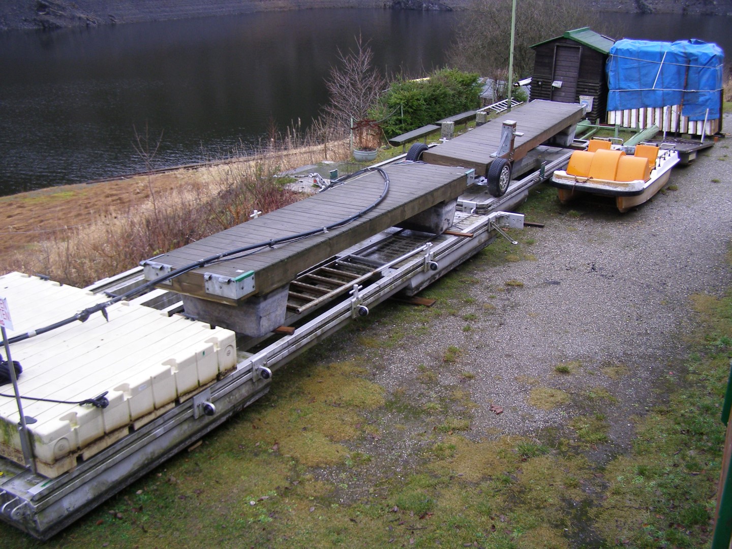 Transport von Schwimmkörpern und Holzauflagen für den Ruderersteg zur Slipanlage. |