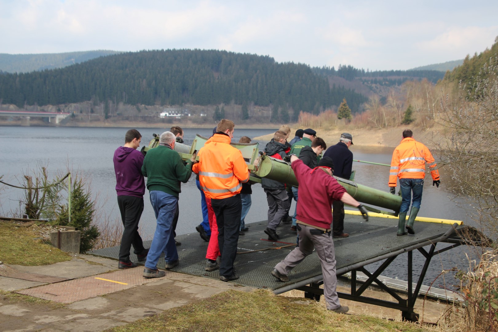 Stegteil I auf dem Weg zur Befestigung am Ufer. |
