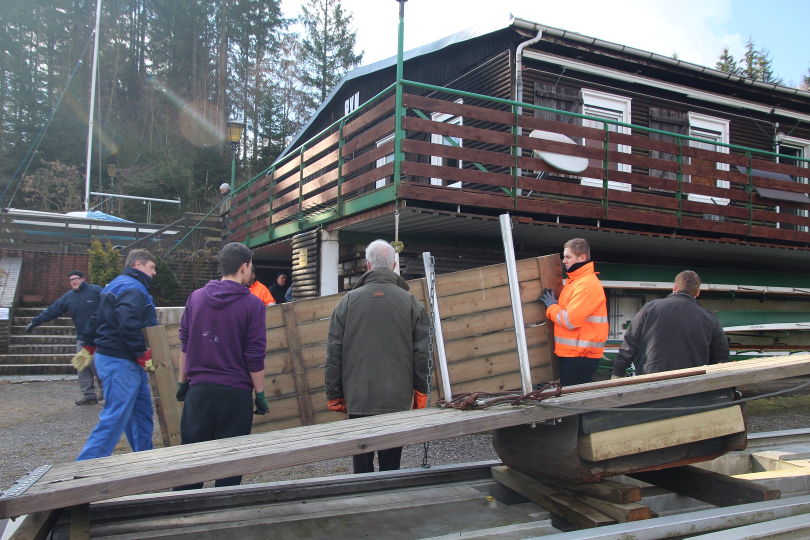 Transport einer Holzauflage für den Ruderersteg zur Slipanlage. |